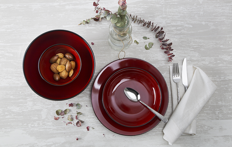 Vermell és una vaixella de porcel.lana fina de bohèmia. Resistent, sotmesa a alta temperatura. Vaixella per una taula càlida i amb estil.